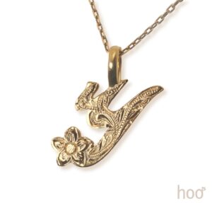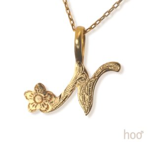 hooのイニシャルネックレスは繊細なハワイアンの彫りに幸せを運ぶプルメリアを添えました。